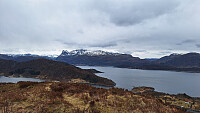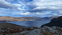 Fulgte først vei, så fin sti innover fra siste hytte og gikk stien til endes. Derfra opp en bratt skråning hvor jeg gjetter på at det er mye vegetasjon om sommeren. Bommet litt der det er som brattest ved Djupehola, så retursporet mitt er bedre. I luftlinje er det kort avstand, men terrenget innbyr ikke til å gå i rett linje. Mye opp og ned også, og mange små skrenter. Vinden tok hardt der den traff meg fra sørøst, men gikk mer i lé her enn på andre siden av fjellet. Mindre snø ut mot havet også. Gikk ned til varden på kanten av stupet der det er fin utsikt rett over fjorden til Florø. Returen gikk radig for å komme tilbake til bilen før regnet. Rakk det akkurat.