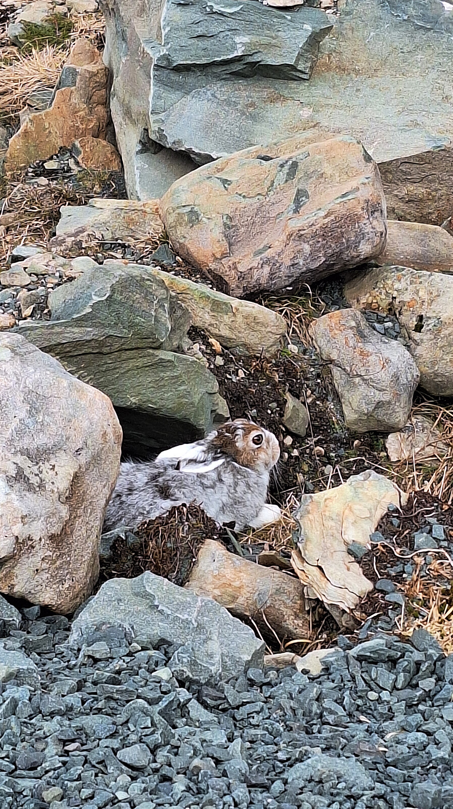 Mye høy lyng opp gjennom skogen, så greit med sti selv om den etter hvert ble temmelig gjengrodd og vanskelig å følge. Det er langt mellom merkepinnene, og hjorten har lagd stier overalt, så det er fort gjort å gå feil. Lagde meg en rundtur. En del snø i skyggesidene, og snøen var lumsk siden den er fra mars og ikke bærer. Men haren hoppet lett over og fulgte meg oppover mot første toppunktet. Der står skiltet mens høyeste ligger på kanten mot Skarvatnet.