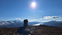 15 grader i dag, og man kunne nærmest se lauvet sprette ut. Varmt også i høyere strøk. Mye høy lyng opp gjennom skogen, så greit med sti selv om den etter hvert ble temmelig gjengrodd og vanskelig å følge. Det er langt mellom merkepinnene, og hjorten har lagd stier overalt, så det er fort gjort å gå feil. Lagde meg en rundtur. En del snø i skyggesidene, og snøen var lumsk siden den er fra mars og ikke bærer. Men haren hoppet lett over og fulgte meg oppover mot første toppunktet. Der står skiltet mens høyeste ligger på kanten mot Skarvatnet.