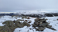 Det var spådd nedbør og vind fra ettermiddagen mens forholdene var fine på formiddagen. Hadde med både brodder og truger, men fikk ikke bruk for noen av delene. Veien til vindkraftanlegget var brøytet og bare devis isete, og det var mindre snø her enn i ytre så trugene ble også overflødige. Flott rundskue fra toppen.