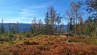 Jeg hadde med sykkel og brukte den fra ca. 320 moh. der det var bom. Riktignok ikke låst, men jeg har respekt for bommer. Fin vei oppigjennom som jeg fulgte gjennom diverse svinger og kryss før jeg var nesten oppe ved toppen etter 6,2 km og 350 høydemetre. Gikk oppom Østre først, og derfra så jeg over mot Kloppåsen og en diger skogens kongen som kom tuslende. Den fikk ikke øye på meg og fortsatte innover. Gammelt trig. punkt på Østre mens Kloppåsen ikke har noen markering. Men fin utsikt til Rendalssølen. Lettgått terreng, og ned igjen trilletrallet jeg fort tilbake til bilen.
