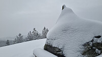 I snøværet tråkket vi oss opp til Blåfjell. Fyra i ovnen og stekte lapper på ovnen. Kosa oss i lenge i hytten her oppe i dag. Nydelig i skogen med alle trærne med snø på. Berit og Jan var med.