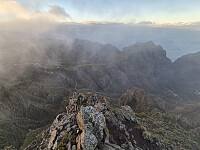 Det var sterk vind fra nordvest hele dagen, så da ble det ypperlige forhold for å klyve opp sydøstrenna til Store Gaustakne med Jorid. Renna er overraskende enkel, gitt hvor bratt den ser ut fra avstand. Øverst i renna er cruxet med grad 1+ kanskje. Nede ved Flisetjønn ble fjellpasset som en trakt og klemte kastvinden helt opp i 30 m/s. Å melde orkan i kastene er stramt, men vi ble regelrett kastet bortover og jeg har kun vært borti sånne kastvinder et par gang i livet.