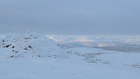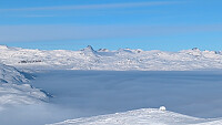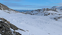 Litt mere snø nå, men fortsatt muligheter for nye riper med stein rett under overflaten. Var ferske spor opp til ryggen. Løssnø og god trening til topps derfra.
