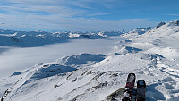 Fantastisk å bryte skydekket i båtskardet. Sol og hvit snø! Stor forskjell på snøen oppover, fra løs til vindpåvirket og lagdelt. Man skal være forsiktig i bratta nå!! Knallhardt lag oppå løs snø i renna opp til Fagerdalshøe, så vi tok en annen variant ned i dalen. Fra Mefjell var det drømmeføre, men ligger et hardt lag godt nede i løssnøen. Med Rando-Harald.