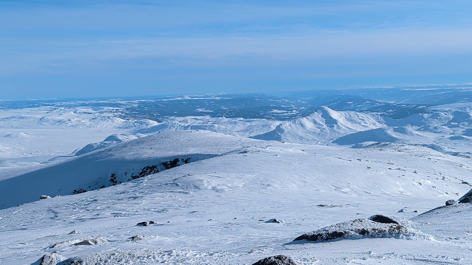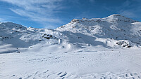 Fantastisk start i sol og hvit snø. Gikk forbi en hyggelig kar oppover veien, han snudde før Mugnebotn. 20-40 cm litt vindpåvirka løssnø opp fra Fleinsendin og ingen spor. Dette var en rå treningsøkt. Fra Mugnebotttjernet var det løst, hardt, is, papp og avblåst. Ekstremt mye drønn i snøen, skvatt hver gang. En god del ras som hadde gått i div brattheng også. Mye stein fra 1459 vannet, men klarte å holde skia på til topps. Var godt å komme til topps, tanken begynte å bli tom etter løssnø tråkkinga. Litt skyer da jeg nærmet meg toppen, men fin utsikt nedover Valdres. Tok det rolig på vei ned med all den varierte snøen og stein som lurte rett under overflaten. Fantastisk trim med mening!