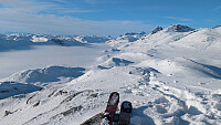 Litt mere snø nå, men fortsatt muligheter for nye riper med stein rett under overflaten. Var ferske spor opp til ryggen. Løssnø og god trening til topps derfra.