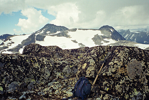 Det begynte å småregne, og vi skulle ta på noe regntette klær. Ikke noe problem det for meg, men verre for Grete… Hennes regnklær lå tydeligvis igjen på Leirvassbu, for i sekken var de i hvert fall ikke. Grete hadde lite lyst til å gyve løs på den lange og brattere vestflanken på Semeltinden under de forholdene som nå rådet. Det er jo som sagt ingen skam å snu, men for meg var det nesten det. Vi ble enige om at jeg fortsatte oppover, så kunne hun rusle rolig tilbake til Leirvassbu igjen.