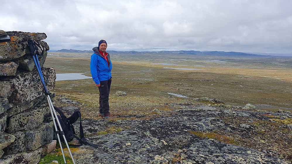Nedi Elsjådalen vokste det noe småkratt, men dette var til lite hinder. Denne vegetasjonen forsvant gradvis etter hvert som vi kom høyere opp mot Elsjåhovda (1387). Videre over denne toppen var det igjen et helt ypperlig terreng å vandre i. Da vi slentret nedover fra Elsjåhovda (1387) på vei mot stien lengre sør, kom sola delvis gjennom en periode og gjorde det riktig så trivelig sånn mot slutten av turen.