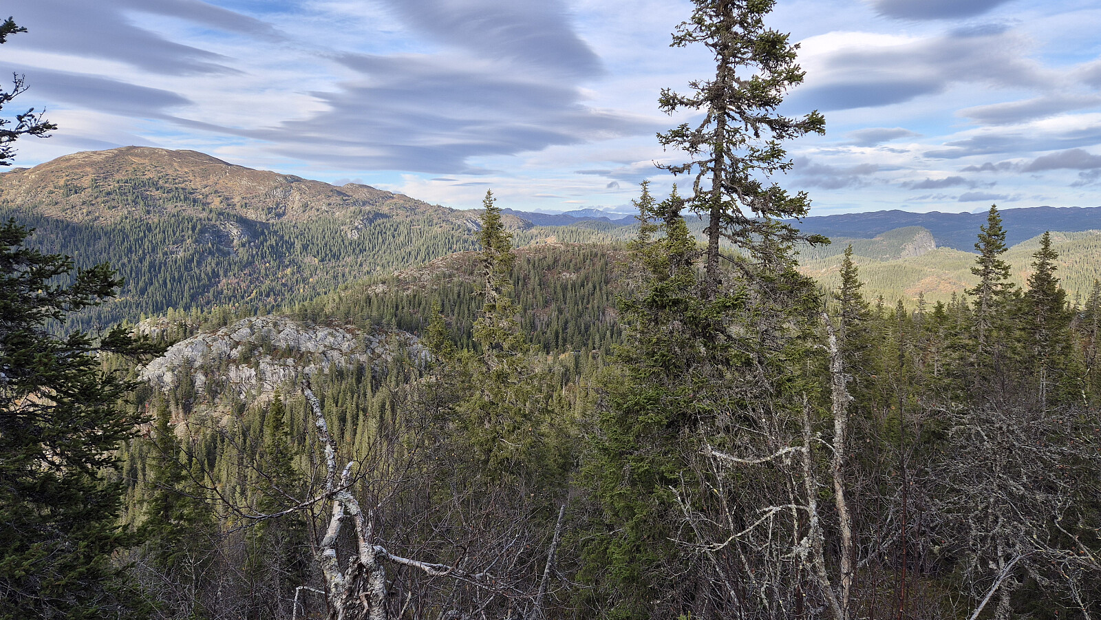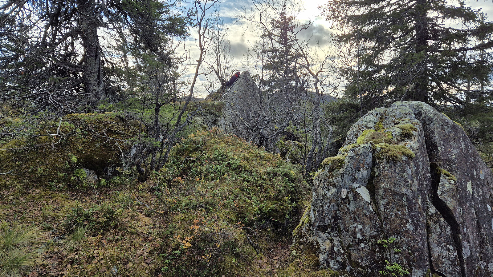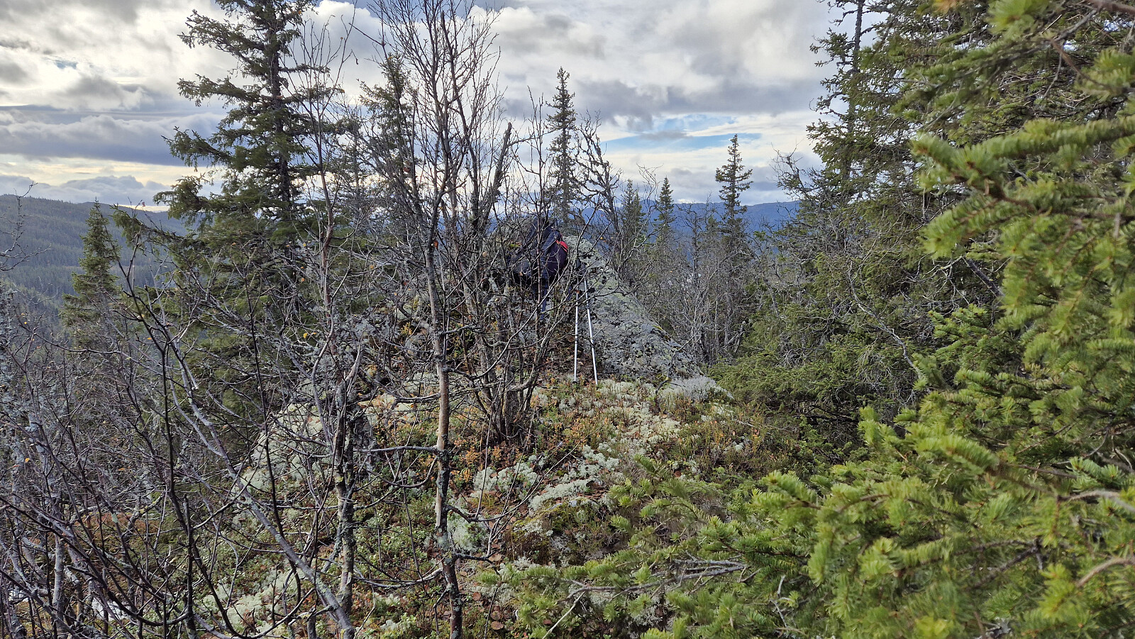Litt opp og ned underveis mot turens siste topp, men stort sett fint å gå i skogen her. Jeg prøvde å holde meg oppå rygger og høyder, for der var det mest åpent.