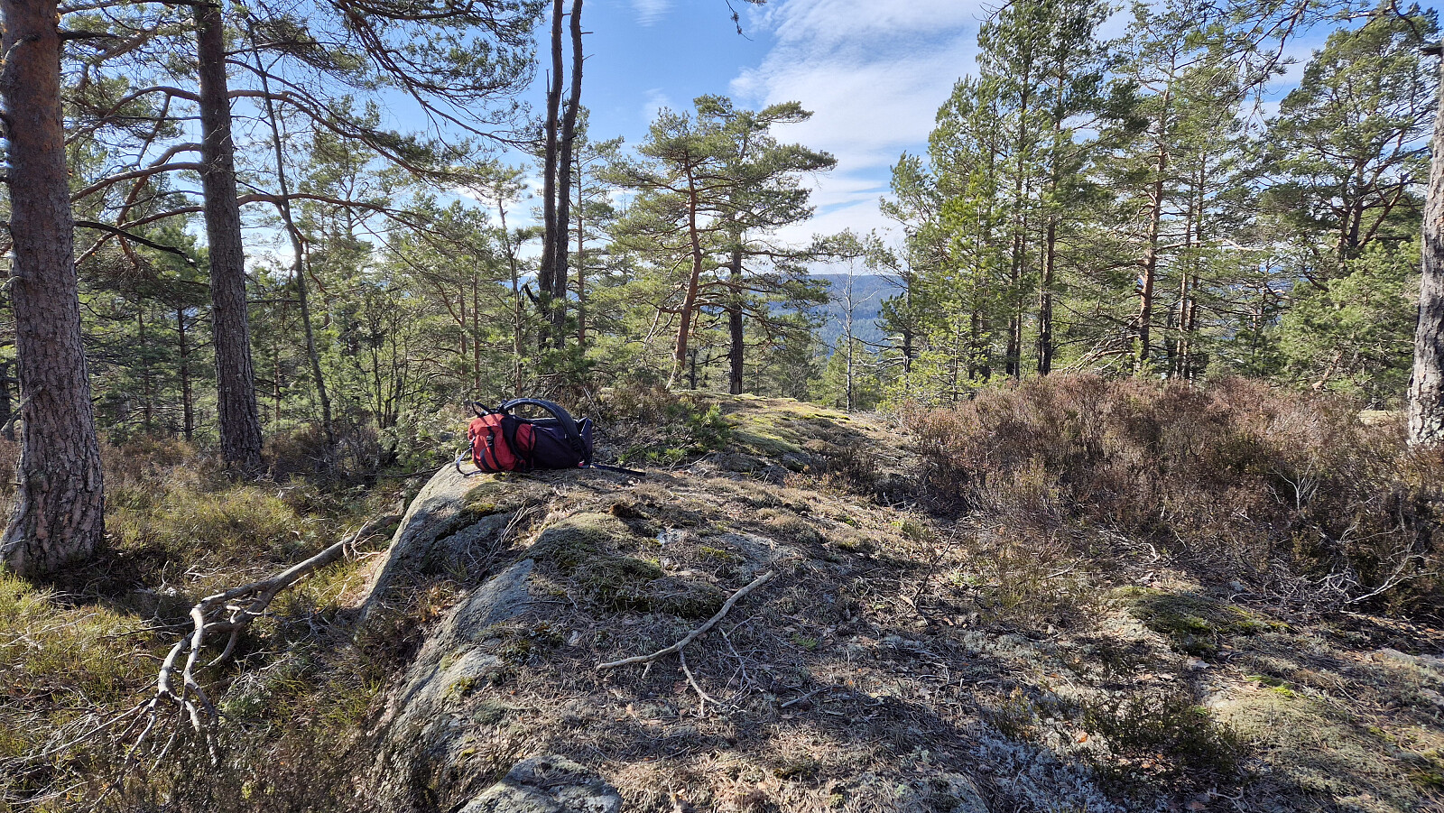 På toppen av Åslandheia (215). Under oppstigningen hit fra Slåttavegen fulgte jeg en svak sti et lite stykke. Den dukket plutselig opp, og forsvant igjen. Noe høy lyng her oppe, og flere andre steder underveis på turen. Særlig oppå høydene og der hvor furuskogen dominerte.
