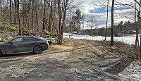 Veistubben som fortsetter forbi den nordre demningen og mot noen hytter, hadde en bom på oversiden av demningen. Det var ingen hengelås på denne bommen nå, og den var kun "låst" med >>>