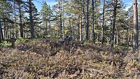 Litt nord for Haugestul tok det av en dårligere skogsbilvei til høyre (mot NØ). Denne veien virket kjørbar med min bil så langt jeg kunne se, men det var jo bare en veistubb på drøyt 150 meter. Det skulle jeg klare å gå ekstra. For da være måte på til latskap ... Ikke visste jeg heller om denne veistubben var kjørbar helt inn. Så da satte jeg igjen bilen i krysset der denne skogsbilveien tok av. Her var det heldigvis plass til bilen utenfor selve veibanen så andre >>>