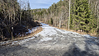 Veistubben som fortsetter forbi den nordre demningen og mot noen hytter, hadde en bom på oversiden av demningen. Det var ingen hengelås på denne bommen nå, og den var kun "låst" med >>>
