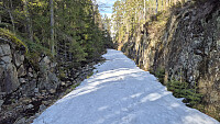 Første del av grusveien var i perioder dekket av snø. Særlig det skyggefulle området der veien går over Svimyrbekken lå det en del snø. Men fra der veien går på østsiden av denne bekken ble det bart, og videre oppover var det i all hovedsak barmark. Men grusveien begynte noen steder å gå i oppløsning pga teleløsningen, og et sted tråkket jeg nedi >>>