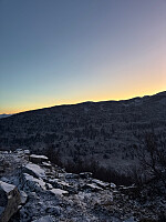Etter å ha vært på Hoslemonuten kjørte jeg lengre ned i hyttefeltet og tok inn på en grusvei. Kjørte på denne et stykke og parkerte ved ei bro. Gikk herfra i terrenget i retning av Nonåsen. Ingen sti eller merking her heller. En del myr som var litt tungt å gå i. Kom til topps da det begynte å mørkne. Ikke så verst topp med utsikt både mot Hoslemo og fjellene rundt.