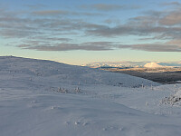 2 cm snø, lett å gå. Sola kom aldri skikkelig fram, men det så fantastisk ut innover mot Jotunheimen i dag.