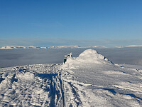 Ville prøve meg litt på truger i dag, og tok dem med i sekken da jeg gikk på ski. Ved nordenden av Fræningen skiftet jeg, og lot skia og sekken stå igjen. Det var tråkket et greit trugespor opp herfra, men mot slutten var dette føyka igjen. Da ble det straks MYE mer arbeidsomt å ta seg opp.