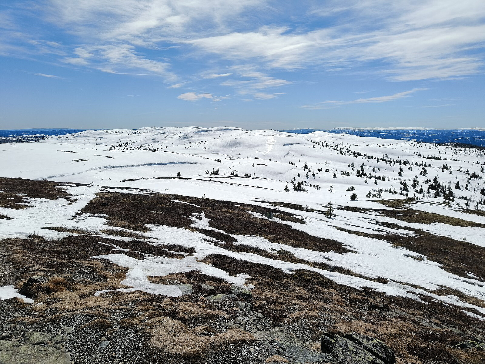 Så tidlig i sesongen er det ikke alltid lett å parkere der en vil, men heldigvis fikk jeg plassen ved Leirungvegen for meg selv; og her var det en bar flekk å stå på. Jeg hadde aldri gått opp til Heimdalshø herfra, men fordelen er at det er motbakker den hele vei til topps - og dermed enkelt ned igjen også! Ulempen er at en må starte så lavt som på 1000 meter, og i dag - som ikke var akkurat den beste dagen formmessig som jeg har hatt - skulle jeg få kjenne litt på dette oppved toppen. Nær 850 høydemeter er det å overvinne. For meg er dette "rekord" for denne vinteren.