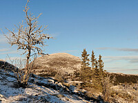 Anette ville opp og se lavskrika på Skåleberget (som jeg møtte der i går), så da tok vi en tur selv om det var fare for mye tåke i dag. Faktisk ble det mer stemning med tåkeskyene som kom og gikk i dag, enn i sola i går. Og jammen kom fuglen fra i går også, men vi fikk ikke fotografert den. Vi ga ham navnet Tassen, og Anette ofret litt av grillpølsa si og la ut i området - forgjeves. Jeg hadde med motorsaga, og gikk i forveien. Noen suspekte store trær over stien ble ryddet før vinteren, og rundt bålplassen på toppen ble det ordnet litt mer ved. Anette tok seg av fotograferingen i dag, så alt er hennes bilder: På hjemveien plukket vi med oss - i mine øyne - en betydelig mengde lav og mose og små gran- og furuplanter, så fruen - og ganske sikkert flere av venninnene hennes >>>