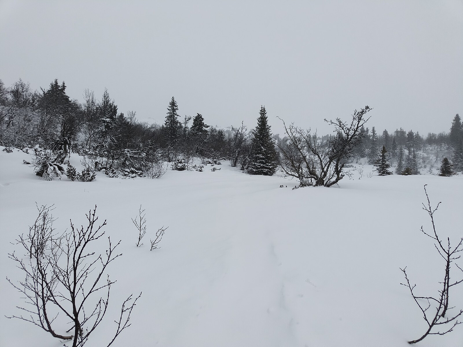 Det var fine forhold for kortfeller og fjellski i dag, med 10 cm pudder oppå en stort sett bærende skare. Litt snaut med snø der einerkrattet dominerer, så det prøvde jeg å unngå. Det var lett snø og begrenset sikt over tregrensa, så det ble som forventet en noe avkortet skitur.