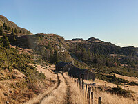 Starta å gå omtrent i det sola kom over Bjødalsfjellet for alvor. Surt vinddrag den første timen i dag, før det ble riktig deilig. Men frosten har gjort det lett å gå over myrete områder nå!