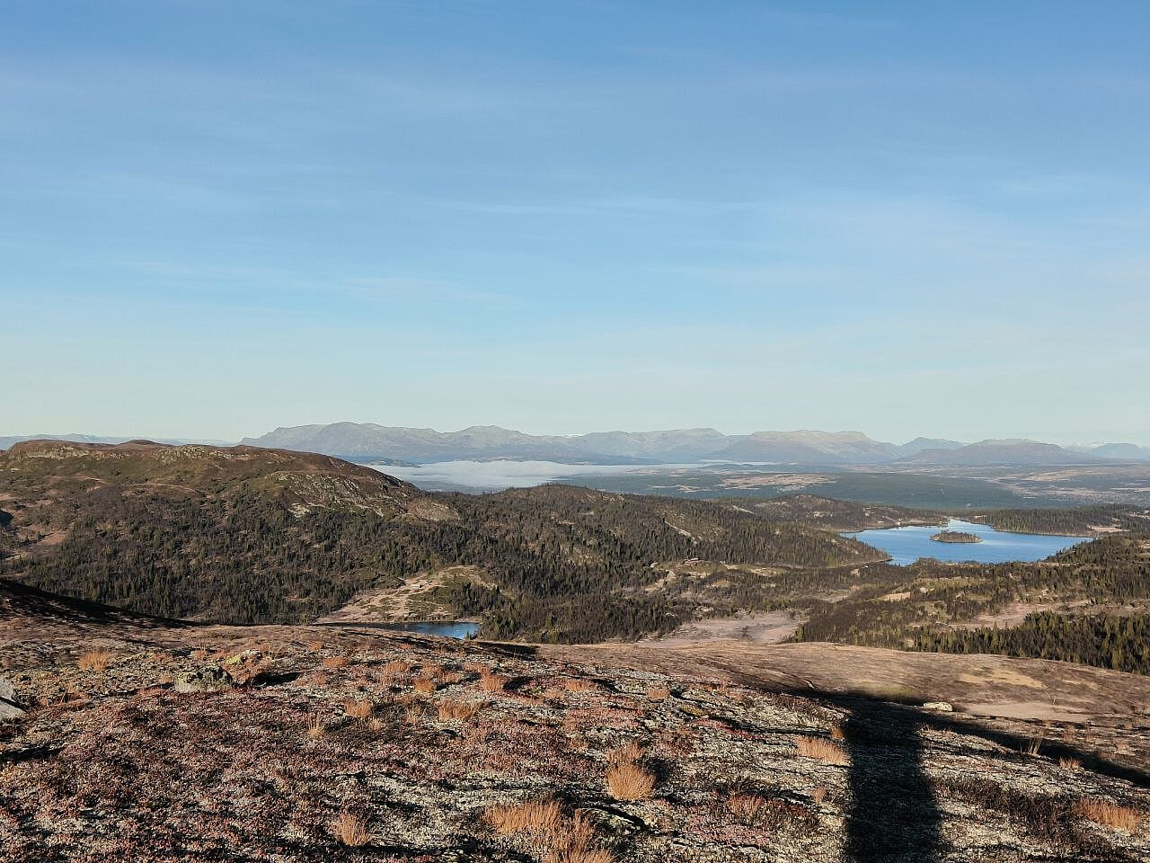 1) Gikk standardveien opp til Haugsetfjellet først i glass-skarp høstluft og skyfri himmel. Det eneste som ødela litt for idyllen var en gravemaskin som dunka og holdt det gående nede ved Huldrastølen. Det er tredje dagen på rad jeg hører denne bråkebøtta her oppe, sukk.