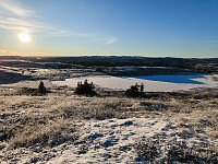 Mildt og lite vind i dag, og deilig å komme opp over tåka som har ligget tungt i flere dager. Tok en noe uvant rute - dels i terrenget - inn til toppen, for variasjonens skyld, men ble dermed også etter hvert litt våt på beina. Møtte noen jegere på småviltjakt.