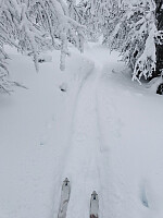 Det var fine forhold for kortfeller og fjellski i dag, med 10 cm pudder oppå en stort sett bærende skare. Litt snaut med snø der einerkrattet dominerer, så det prøvde jeg å unngå. Det var lett snø og begrenset sikt over tregrensa, så det ble som forventet en noe avkortet skitur.