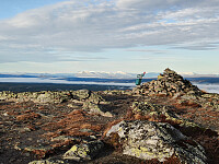 Mildt og lite vind i dag, og deilig å komme opp over tåka som har ligget tungt i flere dager. Tok en noe uvant rute - dels i terrenget - inn til toppen, for variasjonens skyld, men ble dermed også etter hvert litt våt på beina. Møtte noen jegere på småviltjakt.