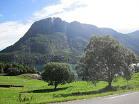 Vi satte igjen en bil ved gården Stabben , ved Sålåsundet, (vest for Stabben 827 m) med tanke på returen på kvelden. Nedenfra så renna fra toppen ut til å være grei skuring helt ned igjen – med mulighet for å søke inn på den skogkledte bratte ryggen dersom uforutsette problemer. Så fortsatte vi med bilen min, helt ned til gården Innerberg i sør, og forbi denne.