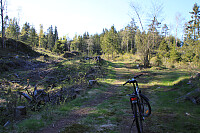 Denne gangen valgte jeg å kjøre til parkeringsplassen ved Trollsvann. Her var det mange biler og tydeligvis et stort utfartområdet. Tok sykkelen fatt og syklet innover langs Trollsvann, forbi Svartvann og inn til Åletjønn. Det ble 4,85 km med sykkel (fin tur). Etter å ha passert Åletjønn og opp bakkene tok det av en godt blåmerket sti innover til Grøntjernet. Fulgte denne. Den var ikke like tydelig alle steder, men godt merket med rundinger på furuene innover. Det skal vanskelig la seg gjøre å gå feil ved så god merking. >>>