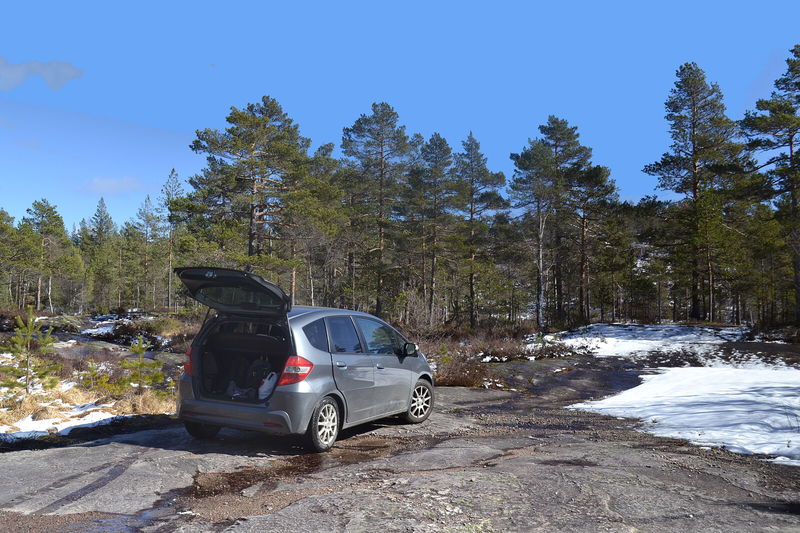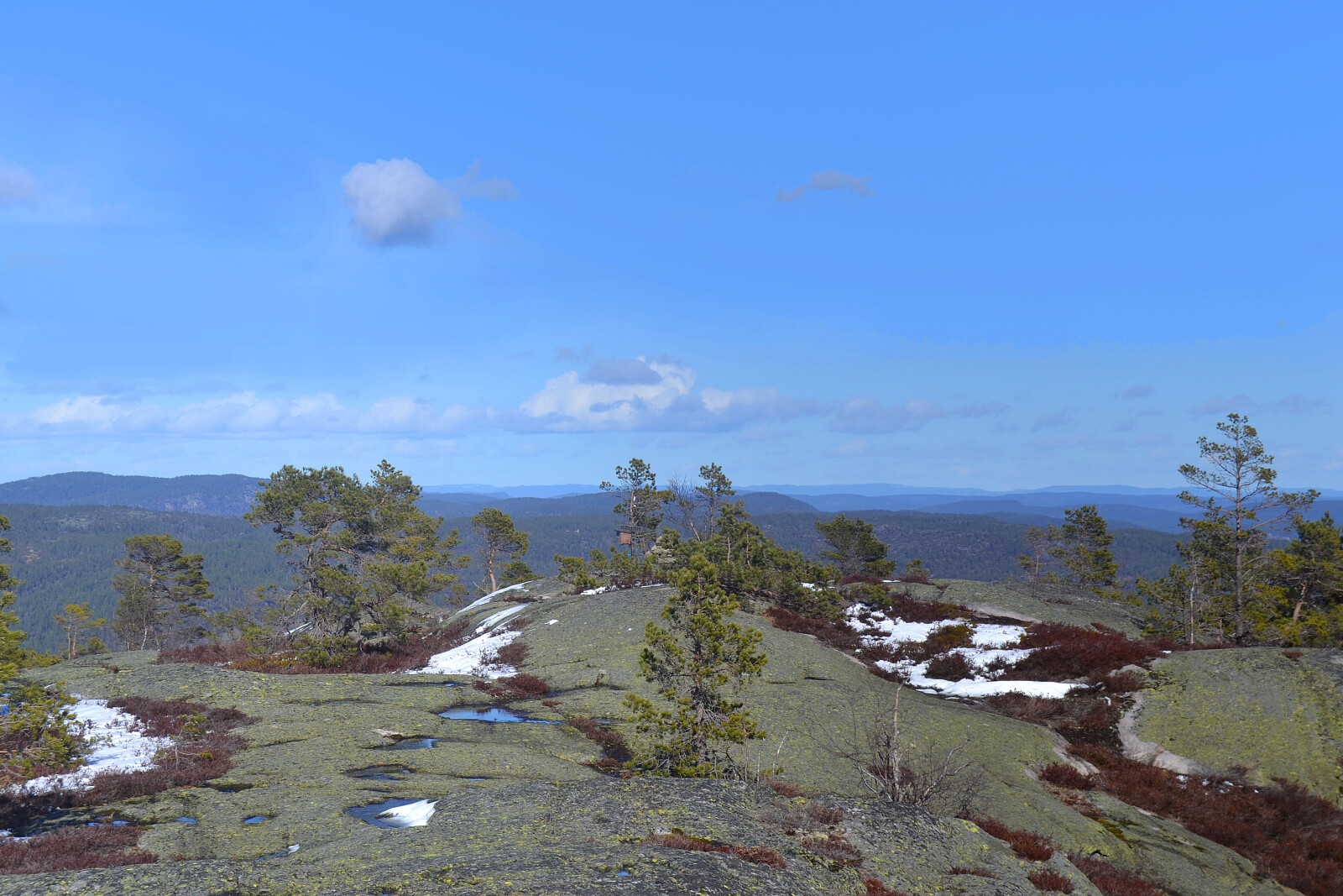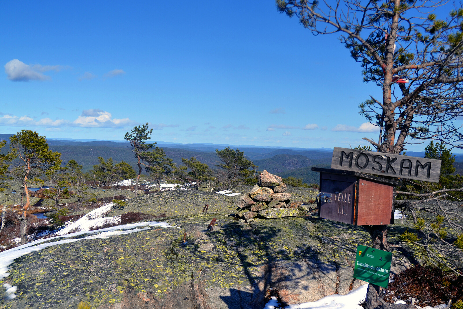 Det var meldt en flott dag med bare sol, men det var regn dagen før, og en del var kommet som snø og sludd, etter en lang og tidlig vår. Snøen ble mer merkbar da vi nærmet oss Felle. Her var det kommet en del i løpet av natten, men mye var på retur. Det lå litt snø innover skogsbilveier her og der, så var spent på hvor langt vi kom innover når vi skulle videre til et par andre topper etter Moskam, hvor bløtt og framkommelig det ville være å kjøre på med lav bil. Men det viste seg å gå veldig greit med litt varlig kjøring et par steder.