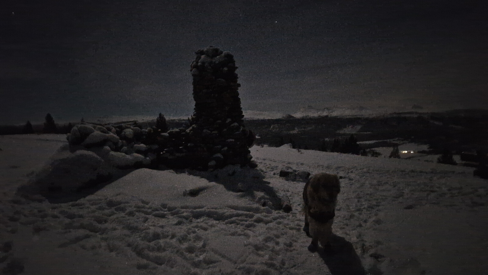 Nesten mildvær I Folldal I dag med bare 10 minus Hehe. Litt gråvær mot Holen og noen snøfiller i lufta. Da jeg kom opp til bjørkeskogen ble det litt vind og det ble bare værre opp mot snaua.Der var det så kald vind og trekk så jeg vurderte om jeg måtte snu. Tok en stopp og tok en justering på klærne så det ble kombi med buff og lue på hue. Det reiv skikkelig. Aron hadde ikke dekken på seg siden tempen var så bra ved start. Lite energi i dag så det gikk i rolig tempo. Rask stopp ved varden før det ble rask retur ned i skogen hvor det var lunt.