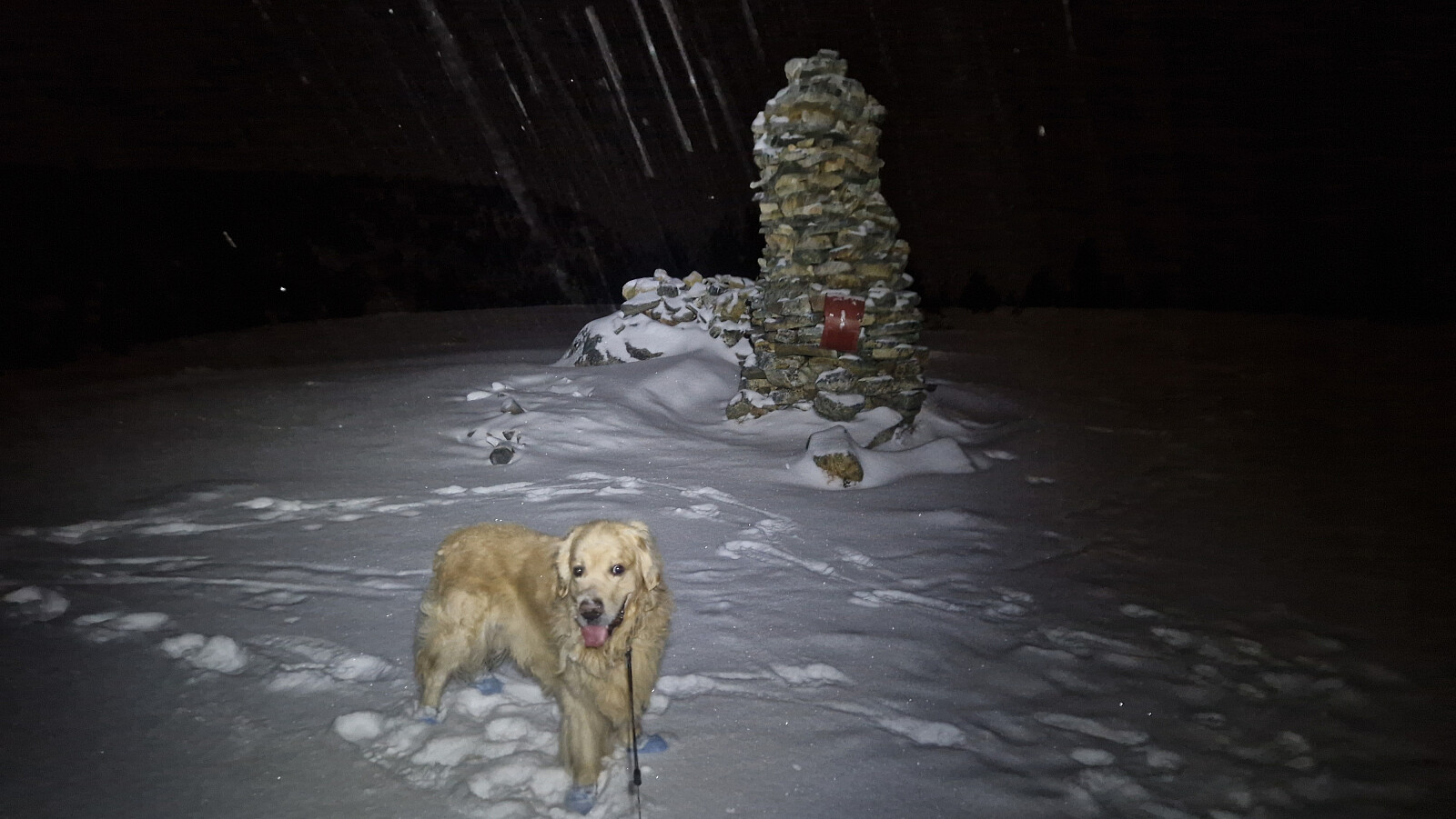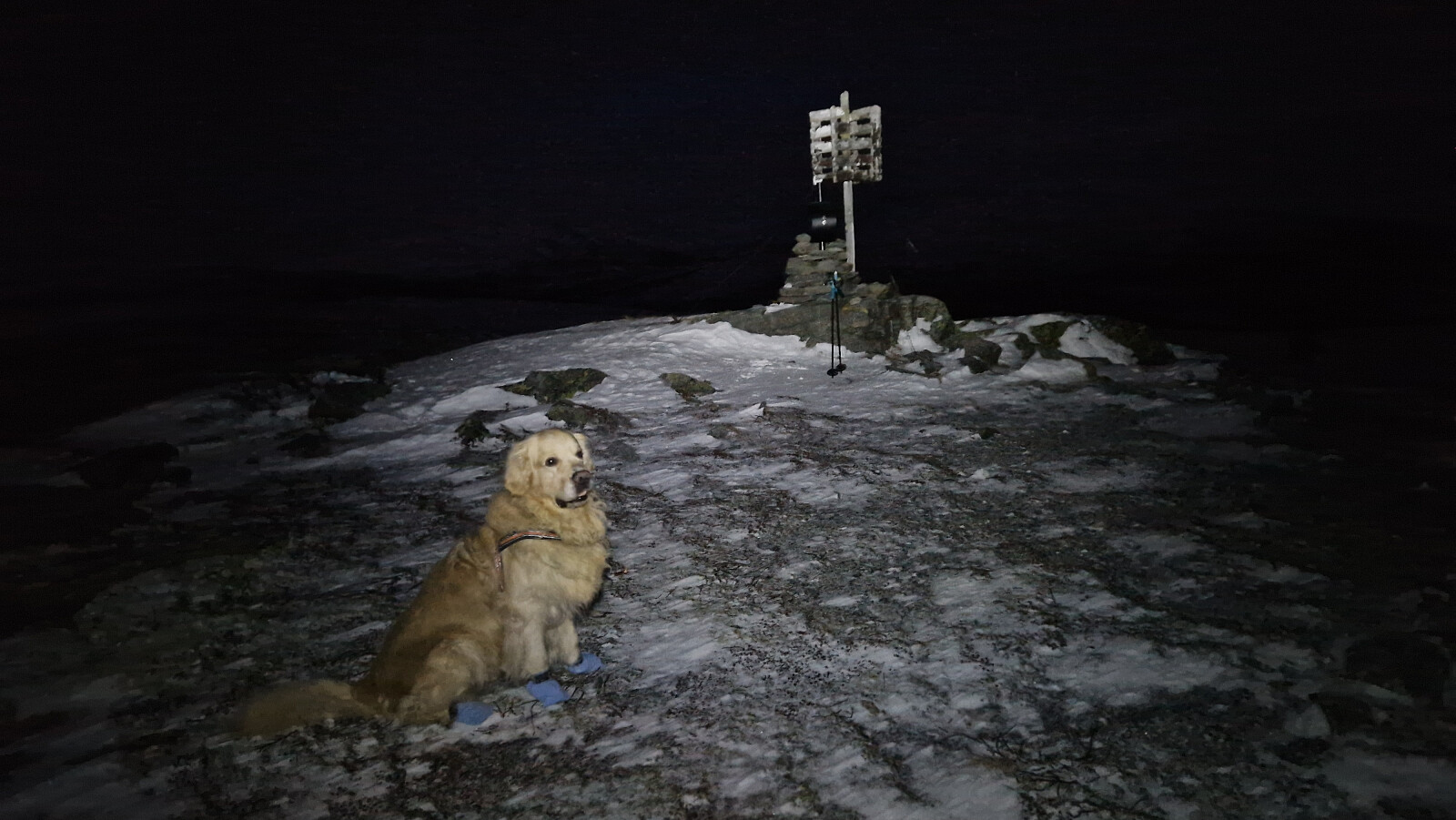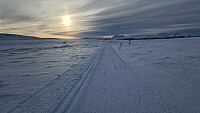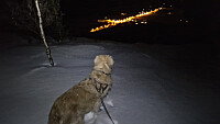 Lenge siden jeg hadde vært her så da ble det kveldstur med Aron. Var litt usikker på føre oppover så tok med meg trugene.Startet på fin brøytet hyttevei før det ble et tråkket spor. Ca 1 km opp så var det kjørt opp scooterløype som kom opp fra skogen. Mulig det skal kjøres hundeløp her i helga siden det var så mye hunder og folk på campen. Scootersporet fortsatte vidre der jeg tok av mot Kakellkletten. Fra her var det over på gammelt trugespor siste biten opp mot toppen. Trugene satte jeg igjen lengere ned. Signerte i trimboka og retunerte ned igjen. Bra tur ble det.