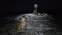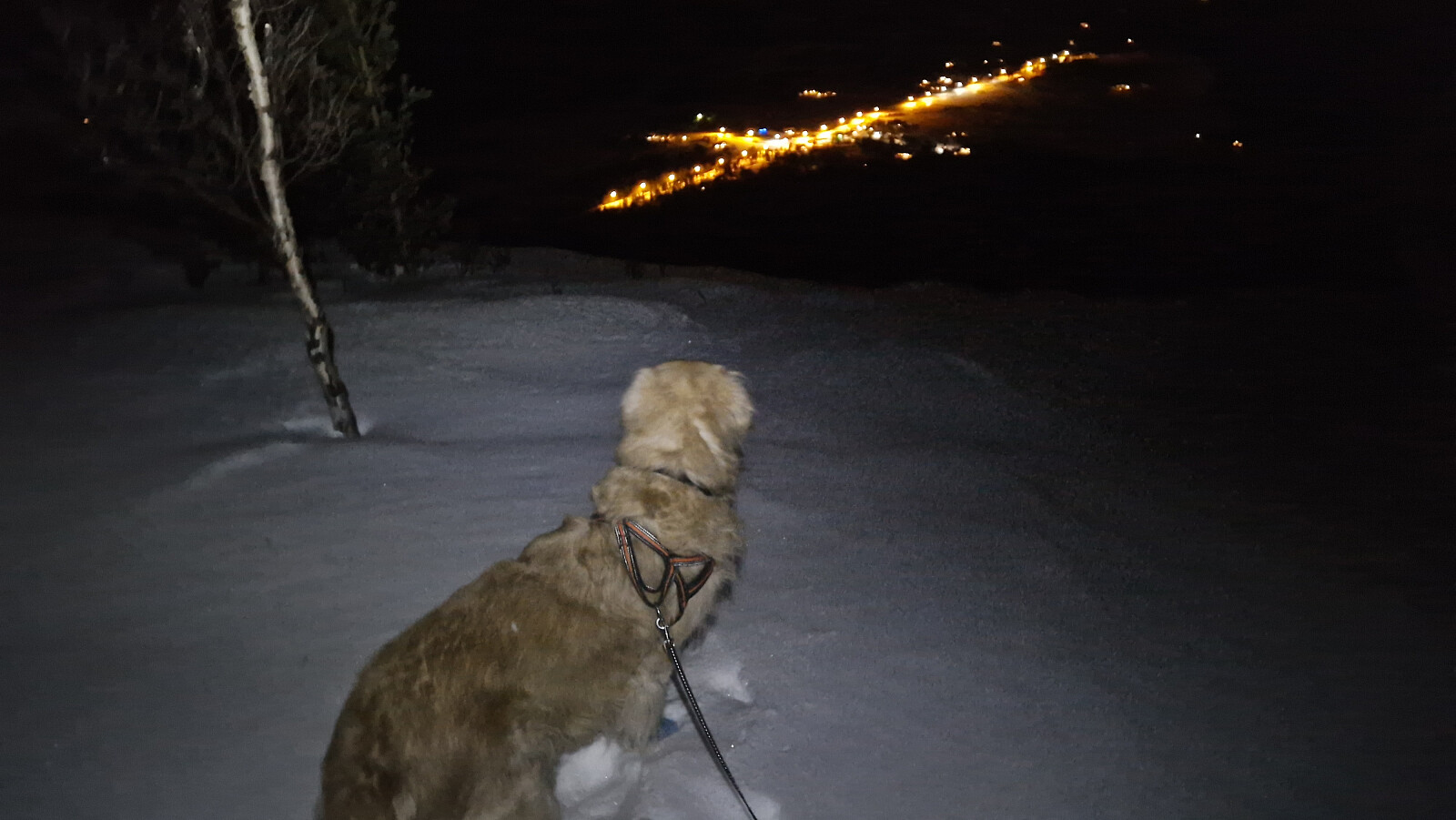 Kveldstur med Aron. Noen hadde gått en tur med truger i sporet siden sist jeg var her så det hjalp på. Rundt 20 minus at i kveld og Aron sprang løs. Den røde blinklampa som Aron har på seg er helt super.Vises på laaaaang avstand (og på bildet) hehehe