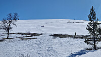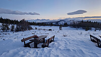 Start fra Sveen i kveld. Planen var å truge opp spor mot toppen. Fulgte skiløypa før jeg tok mot Knutshovda. Alt av spor var snødd igjen så det ble ei grei økt. Så konturer av spor og ellers var det å gå på måfå for å finne det litt hardere underlaget. Aron datt igjennom mye men like glad for det. Veldig mye jagerflyaktivitet i området i kveld og i det vi var på tur opp siste biten så kom det et solid drønn. Var nok et fly som brøt lydmuren. Jeg med musikk på ørene skvatt mens Aron var like rolig. Signerte i trimboka og retunerte ned igjen.