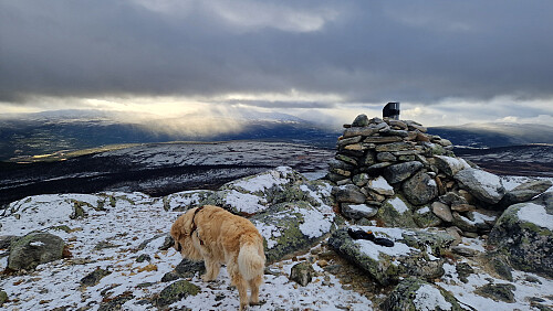 Erling ble med på tur i dag så vi kjørte opp til parkeringen ved benkene. Endelig var 1. November her og det betyr slutt på utvidet båndtang i Folldal så i dag ble mye løping på Aron. Fulgte stien opp på toppen av Håneskletten først. Signering i trimboka før vi satte kurs rett ned mot Jensaseter. Fulgte så skiløypetraseen tilbake mot bilen. Været var egt greit nok så vi tok en svipp bortom Grønhøbua. Her ble detcen kort pause i bua før vi retunerte tik bilen. Kald vind men ellers greit. Aron sprang løs og storkoste seg. Herlig å se en så glad hund.
