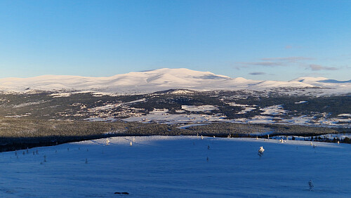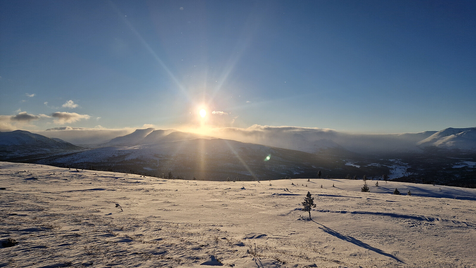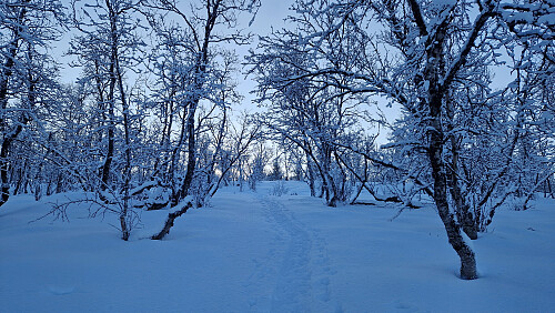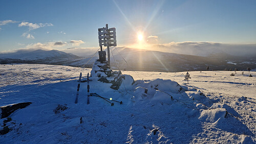 På tide med en dose fjellski I dag. 27 friske minusgrader hjemme på mårran og blå himmel satte standard for dagen. Tok fjellski og fulgte trugesporet mitt. Noe mildere I skogen oppover men iskald trekk på toppen. Signering i boka og retur ned igjen. Aron sprang løs.