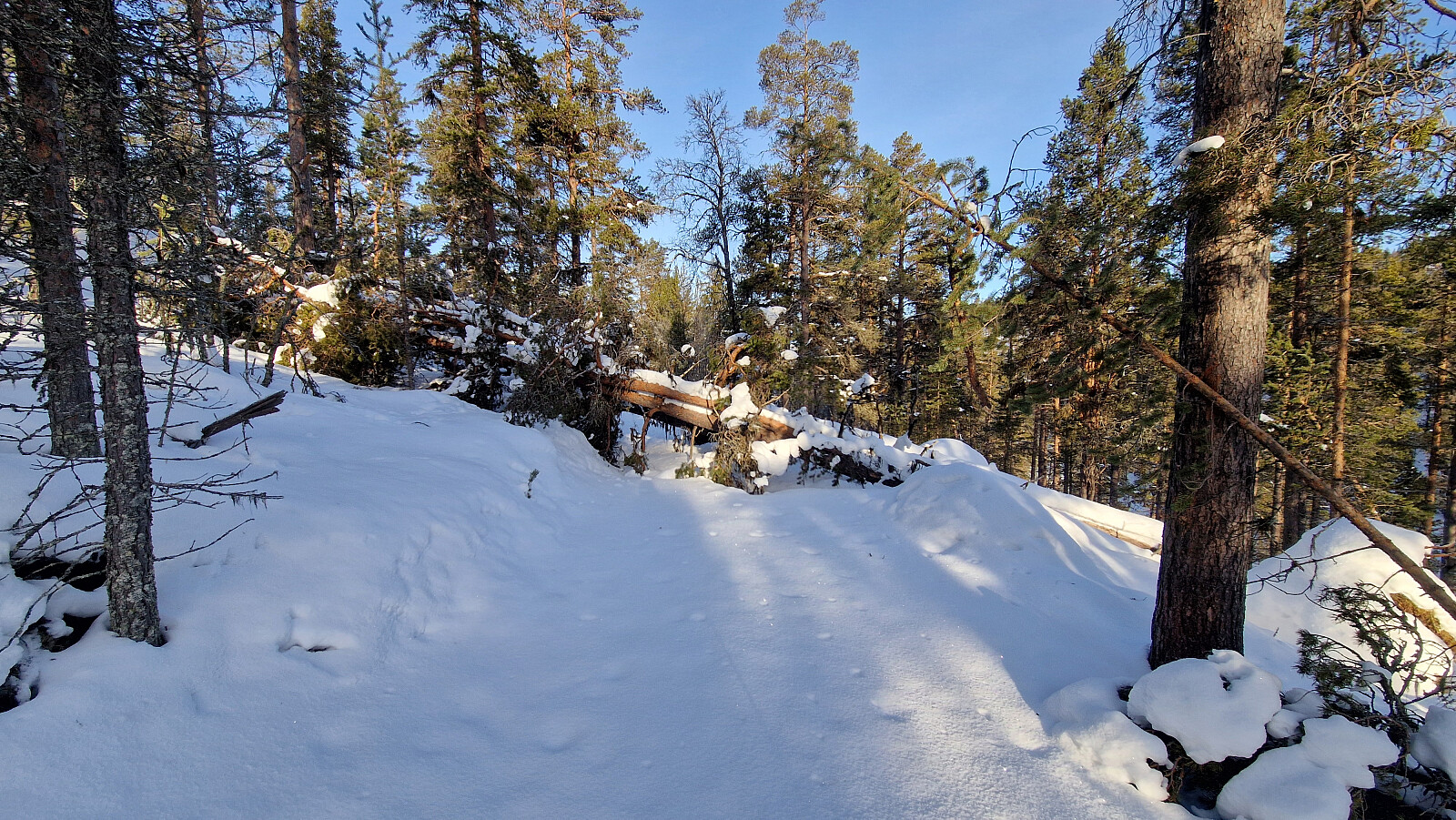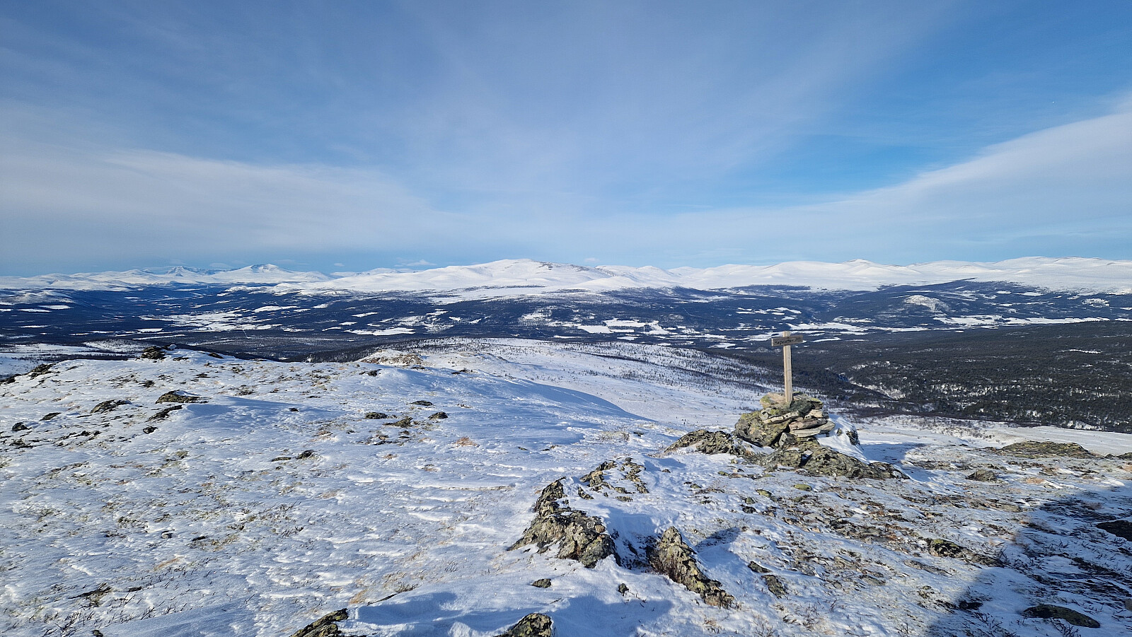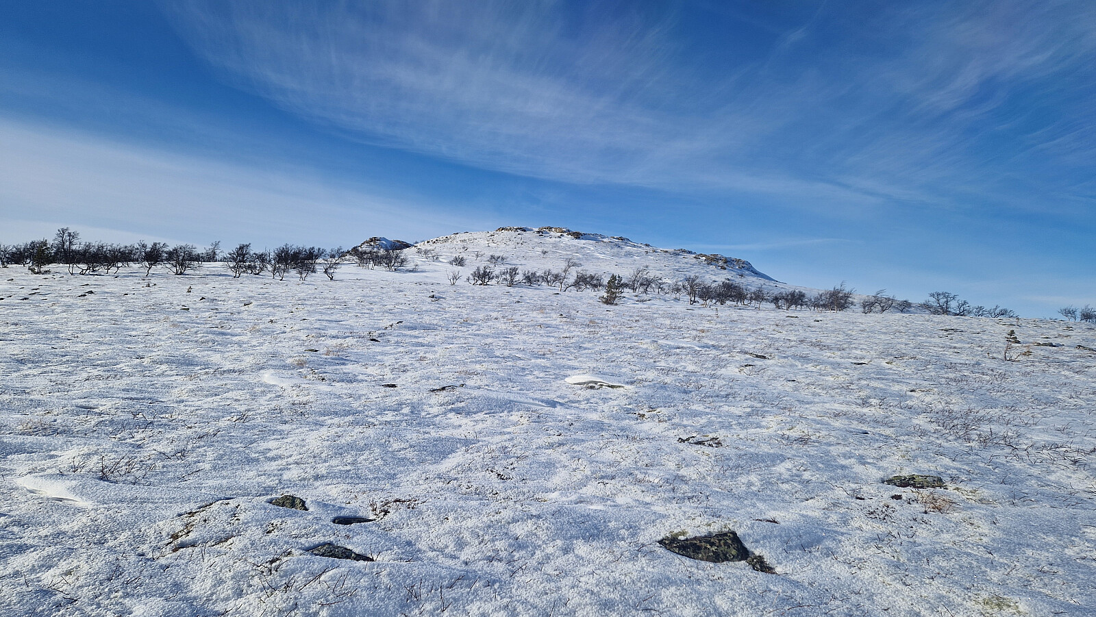 I dag fikk jeg lyst på ei real økt på fjellski.Kulden har bitt seg fast og jaggu var det 30 minus ved start i Stormoegga. Hadde på forhånd sjekket om det var kjørt opp scooterløype men det var det ikke. Så her ble det det brøyting av spor oppover og helt opp på snaufjellet. La opp til et rolig og jevnt tempo slik at jeg ikke skulle anstrenge lunger for mye i kulden. Ble fort mildere oppi skogen og det gikk veldig greit. Et stykke lenger fremme kom jeg til flere trefall over veien/traseen. Full sperring så fikk varslet de som skal stikke løype. Vel oppe på snaufjellet ble det hard skare og lite snø så her gjaldt det å finne partier med snø. Opp mot toppen ble det mer skavler og oppe på ryggen måtte skia av og bæres pga nesten ikke snø. Ganske kraftig vind så gode klær var godt å ha i dag. Ble et raskt besøk ved varden for her tok vinden godt og den var iskald. Men lite snø og harde skavler så ble det ingen god skikjøring ned igjen. Fulgte stort sett samme spor ned til skogen og vidre tilbake til bilen. Kun 16 minus ved bilen da jeg kom tilbake.