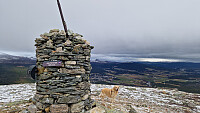 Fikk lyst på en tur til i finværet så vi kjørte rett bort til turstart da vi kom fra Grimsbu. Masse jegerbiler langs veien og parkeringsplassen der jeg pleier å parkere var opptatt. Startet litt bortenfor istedet og fulgte den vanlige stien til topps. I det jeg nærmet meg toppunktet så jeg to personer ved varden og da jeg kom opp satt de rett nedenfor på andre siden og koste seg i sola .Rask signering og retur samme vei. Bilde tatt på tur ned for å ivareta personvernet.hehehe.