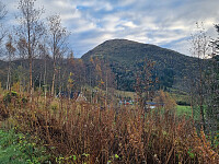 I Gjemdalsskaret. Her tar jeg av fra traktorveien og følger sti helt til topps. Stien er skiltet og merket med blå plastbånd på trestammene.