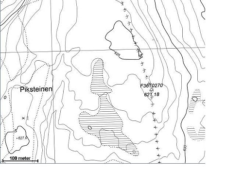Dette måtte utforskes i praksis og jeg kjørte Vestfold på tvers over Gregershullet inn til turisthytten Presteseter. Fulgte så vei vestover, og tok til venstre langs en gjengrodd traktorvei merket sporadisk med røde bånd etterhvert. Jeg navigerte meg greit opp til trig.punktet på 621 moh, og tok så en kompasskurs langs kommunegrensen nordover. Jeg gikk så denne kursen ca 150 meter til terrenget begynte å gå nedover igjen. Høydeforskjellen med trig.punktet var + 4 meter i følge høydemåleren, jeg hadde med andre ord fått terrenget til å stemme med kartet. Tidligere besøk på Vindfjell sier meg at dette fjellet ikke har en sjanse, siden her er ingen 4 meter høyere punkter i nærheten av trig.punktet, så dette punktet litt ned i siden av haugen bakom Piksteinen er nok høyest med sine 625 meter. Jeg markerte ikke punktet, men tror det er ca ved et litt krokete grantre jeg har avbildet.