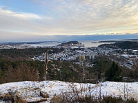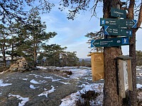 Årets første tur gikk til den omvendte båt og Skråstadfjell i Jegersberg. Gikk via Jegersberggård, nedre Jegersbergvann og opp til Øvre jegersbergvann via gode grusveier og godt skiltet. Det var ganske glatt på veien, så det var ikke full fart. Fulgte så skilt til Den omvendte båt, grei sti opp fra Kyrtjønn, men glatt på steinene og på svabergene opp siste biten til den omvendte båt var det speilis så måtte holde meg i krattet og gå litt omvei for å komme trygt opp. Kom en liten hagelbyge da jeg var på toppen, men kjempefin utsikt. Fulgte så sti skiltet mot Skråstadfjell. Tidvis glatt her også men god sti til masta og gikk opp på en lille forhøyninga ved siden av masta. Ikke noe utsikt å skryte av her. Fulgte så stien tilbake igjen, men gikk mot Salvestjønn når skilt >>>