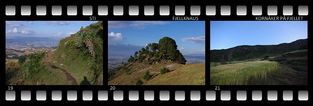 Det ligger et par mindre fjell mellom Addis og Wochecha, og man må enten klatre over et av disse, eller passere gjennom et trangt dalføre mellom dem for å komme til foten av Wochecha. Jeg gav meg i kast med det ene av disse fjellene. Etterhvert som jeg nærmet meg utkanten av byen, hadde jeg lagt merke til en bred sti som snoket seg oppover fjellsida mellom husene, og denne var ikke vanskelig å finne. Det var temmelig bratt oppover disse bakkene, men det bød ikke på noe problem å holde tritt med lokalbefolkningen, som benyttet stien som ferdselsåre. Et stykke oppi bakken tok tettbebyggelsen slutt, og jeg ble gående i vakker natur; vekselsvis i skog og i åpent lende. Stien var imidlertid bred og fin, og lett å følge. Utsikten over Addis ble bedre jo høyere opp jeg kom. Jeg tok meg tid til å stoppe opp et sted og knipse noen fine utsiktsbilder over byen.