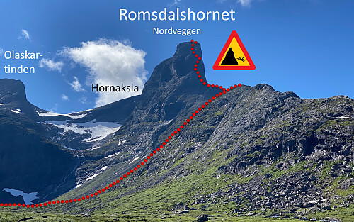De to som var foran meg hadde satt fra seg sekkene da jeg tok dem igjen der oppe på fjellryggen, og det så ut til at de var i ferd med å ta seg en pause. Jeg hilste «god dag», og spurte dem om de var tenkt seg opp på Romsdalshornet. De bekreftet at det var de, og så spurte de om jeg også var tenkt meg dit opp. Nå liker jeg ikke å selge skinnet før bjørnen er skutt, så jeg forklarte at jeg egentlig så på det som en rekognoseringstur, som jeg tar for å gjøre meg opp en mening om hvorvidt det lar seg gjøre for en på mitt nivå å klatre opp der eller ikke. «Er det grei skuring, så klatrer jeg helt opp,» sa jeg. «Skulle det derimot vise seg for vanskelig, så snur jeg og klyver ned igjen.» Jeg forklarte dem at jeg hadde besteget Romsdalshornet to ganger via Hall's renne, og at jeg tenkte å gå ned igjen den veien hvis jeg kom meg til topps. «Men mest sannsynlig blir det vel til at jeg snur der oppe et sted,» sa jeg, «så det kan hende vi møtes igjen når jeg er på vei ned, og dere er på vei opp.» Og så sa jeg adjø, og la i vei oppover fjellryggen.