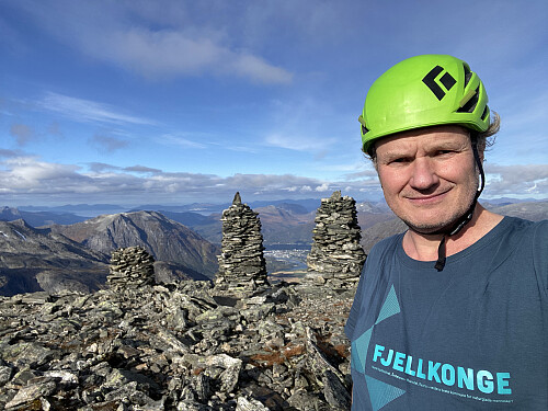 På toppen tok jeg meg tid til litt mat og drikke, jeg tok meg tid til å ta noen utsiktsbilder (bilder ## 15-17); og jeg tok meg tid til å leite opp boka, som lå inne i Heen's hytte, og føre inn navnet mitt der (dette siste tente jeg ikke på en gang de to foregående turene jeg hadde opp hit. Jeg passet også på å ta et selfie-bilde med min nye Fjellkonge-T-skjorte på (bilde #14). Norsk Fjellfestival A/S, som holder til på Åndalsnes, deler ut tittelen Fjellkonge eller Fjelldronning til de som dokumenterer at de har besteget Gjuratinden, Kvanndalstinden, Store Venjetinden, Romsdalshornet, Store Trolltinden, Kongen og Dronninga; og så når man har fått den tittelen, kan man få kjøpt en T-skjorte hvor det står enten Fjellkonge eller Fjelldronning fremme på brystkassa; mens det på ryggen er oppfort navnet og høyden på de 7 toppene. Jeg hadde nylig fått tilsendt denne T-skjorta, så da syntes jeg det var en artig gimmick å ta et bilde av seg selv med nettopp denne trøya på her oppe på selveste Romsdalshornet.