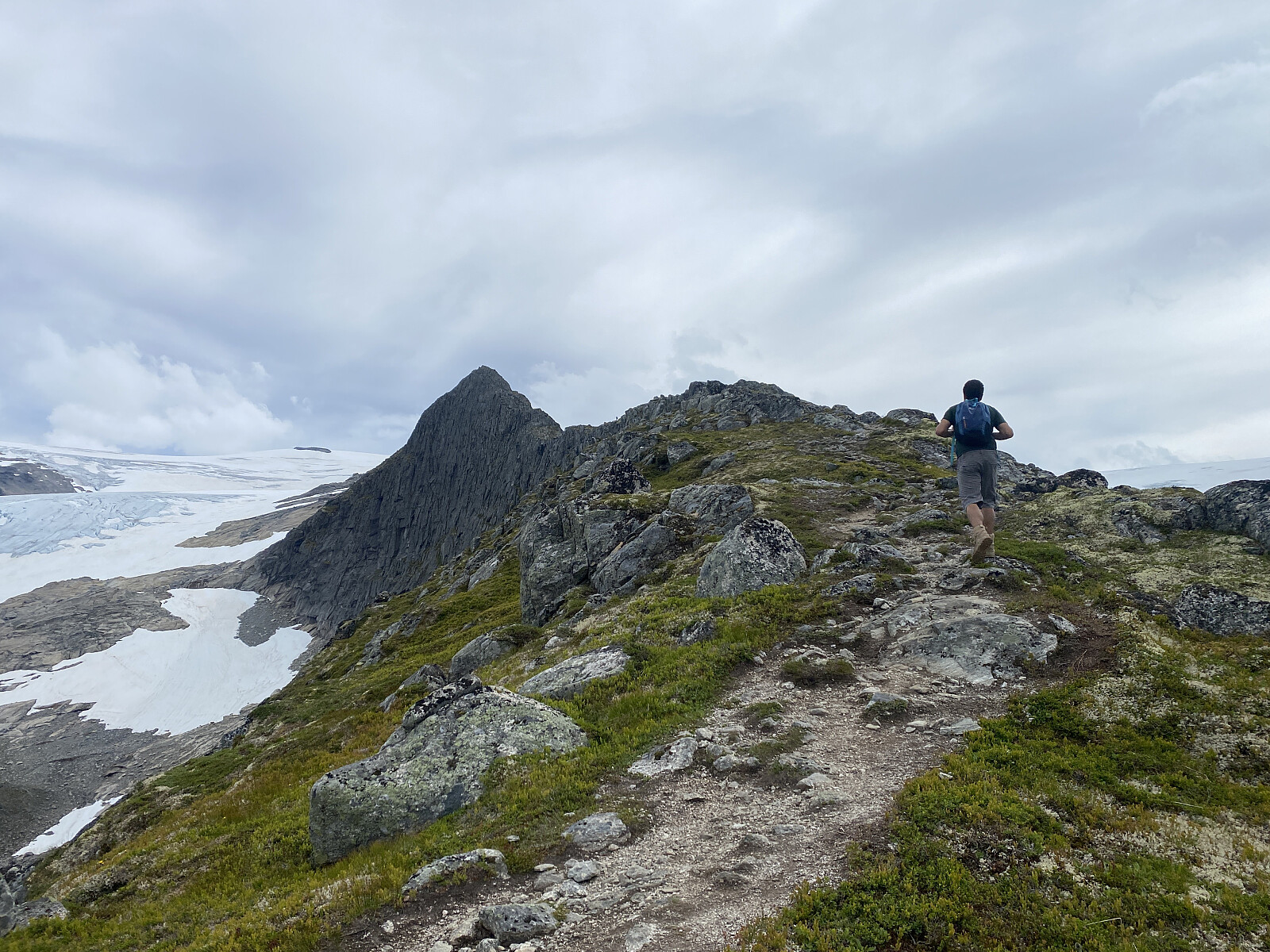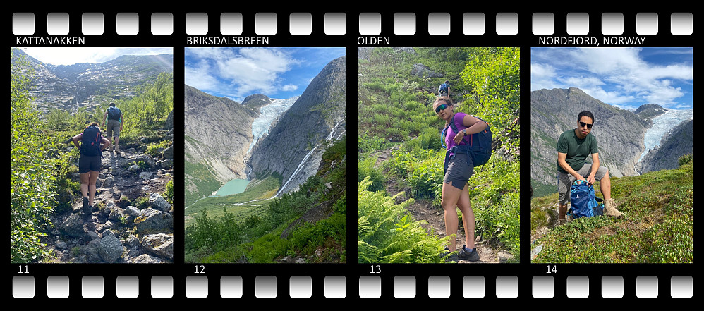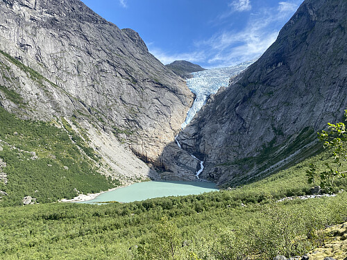Fra den stien vi nå kom inn på, kunne vi nesten helt fra starten se bort på både Briksdalsbreen og Briksdalsvatnet (bilde #8), og jo høyere opp vi kom, jo mer spektakulær ble utsikten. Stien ledet oss først oppover i fjellsida under Tjøtabreen, en bretunge som vi ikke fikk sett ordentlig før vi kom litt opp i høyden, for det er bare såvidt litt av den henger ned forbi kanten på platået som breen ligger på (bilder ##15 & 21). Etterhvert kom stien over skoggrensa, og da skrået den gradvis bortover mot nordryggen av Kattanakken. Denne nordryggen starter egentlig helt nede ved Briksdalsbreen Fjellstove, men den nederste delen er veldig bratt, og ville vært tung å klyve. Ved å følge stien, kommer man inn på nordryggen omtrent akkurat der den flater litt ut, på ca. 970 høydemeter. Akkurat der ryggen danner et knekkpunkt mellom den veldig bratte, og ikke fullt så bratte delen, får man forøvrig et veldig fint utsiktspunkt (bilde #16).