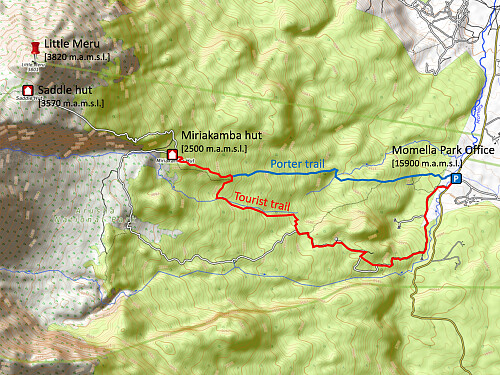 After breakfast I brushed my teeth, and then packed the rest of my stuff. This morning the four of us set out from Miriakamba at about 8:20 p.m.; Holson, me, Frank and the ranger. We hadn't walked long, before we encountered large cake-like poo discs on the trail; larger than cow poo, but smaller than elephant poo. These are buffalo poo, the ranger explained to us, and from their fresh appearance, he could tell that they were only a few hours old. The trail went north to begin with, but then it turned west, and upwards along the mountain ridge that leads up to the Saddle Camp Site [i.e. the mountain ridge seen on image #22]. On all maps that I've seen, as well as on web sites and in tourist brochures, the accommodations on Mount Meru are always referred to as the Miriakamba Hut and the Saddle Hut. I believe these names date back to a time when there was actually just one hut on each of the two sites. Since the two facilities have later expanded, so that there are currently multiple huts on each site, I have largely chosen to refer to them as the Miriakamba Camp Site and The Saddle Camp Site in this tour description.