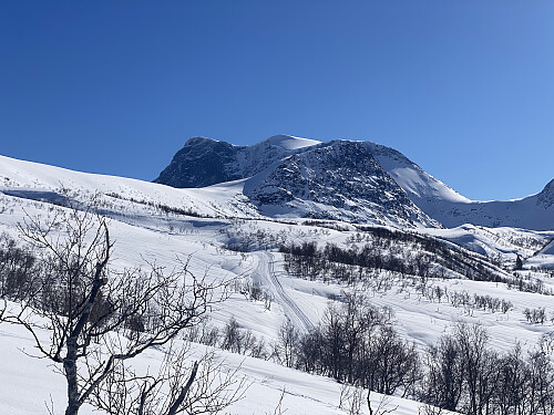 Nedkjøringen fra toppen var super, selv om der var enkelte harde, og enkelte avblåste partier. Når jeg nærmet meg sadelen mellom toppen og midtknausen, satte jeg rett utfor i retning like til venstre for midtknausen, for ikke å miste for mye fart i sadelen. Etterhvert som farta likevel avtok, svingte jeg gradvis mer til venstre for å få farten litt opp igjen, og holdt nå nedunder midtknausen på vestsida av denne. Kort etter krysset jeg mitt eget spor fra turen opp, og fortsatte så på vestsida av fjellet til jeg nesten var oppunder nordknausen (se GPS-tracking). Her satte jeg utfor i vanlig slalom-modus, men det fremgår ikke så godt fra trackingen, ettersom GPS-enheten var innstilt til å kun loggføre posisjonen hvert tiende sekund, slik at den har en tendens til å ikke få med seg alle svingene. Jeg passerte mellom hyttene nede på Skarsetra, og fant så Skarseterveien, som jeg mer eller mindre fulgte ned igjen til Skare.